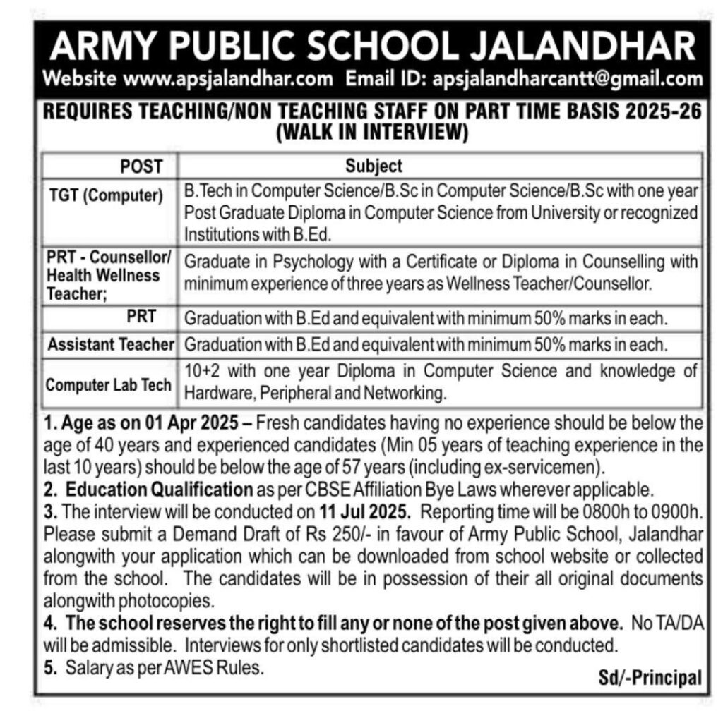 • Please submit a Demand Draft of Rs 250/- in favour of Army Public School, Jalandhar alongwith your application which can be downloaded from school website or collected from the school.