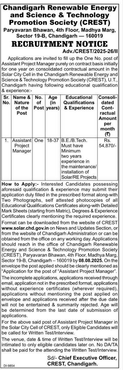 | How to Apply:- Interested Candidates possessing aforesaid qualification & experience may submit their application duly filled in the prescribed format along-with Two Photographs, self attested photocopies of all Educational Qualifications Certificates along-with Detailed Mark Sheets (starting from Matric), Degrees & Experience Certificates clearly mentioning the required experience. Format can be downloaded from the website of CREST www.solar.chd.gov.in on News and Updates Section, or from the website of Chandigarh Administration or can be obtained from the office on any working day. Applications should reach in the office of Chandigarh Renewable Energy and Science & Technology Promotion Society (CREST), Paryavaran Bhawan, 4th Floor, Madhya Marg, Sector 19-B, Chandigarh – 160019 by 08.08.2025. On the envelope the post applied should be clearly mentioned as “Application for the post of “Assistant Project Manager”. |
