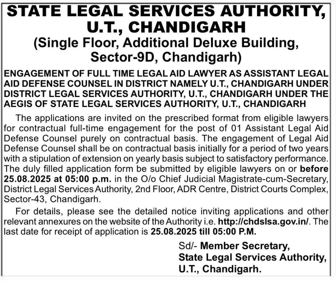 Chandigarh State Legal Service Authority Vacancy 2025STATE LEGAL SERVICES AUTHORITYU.T., CHANDIGARH |