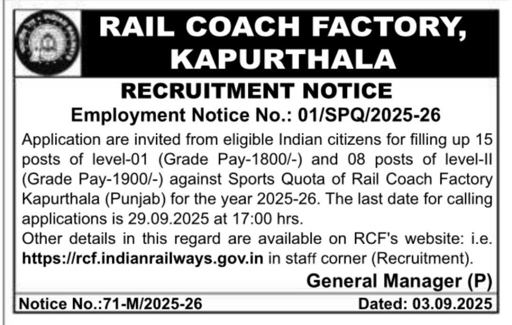 Kapurthala Rail Coach FactoryKapurthala Rail Coach Factory Recruitment 2025Sports Quota Various Post Recruitment 2025Employment Notice No. 01/SPQ/2025-26www.RozgarNews.Com