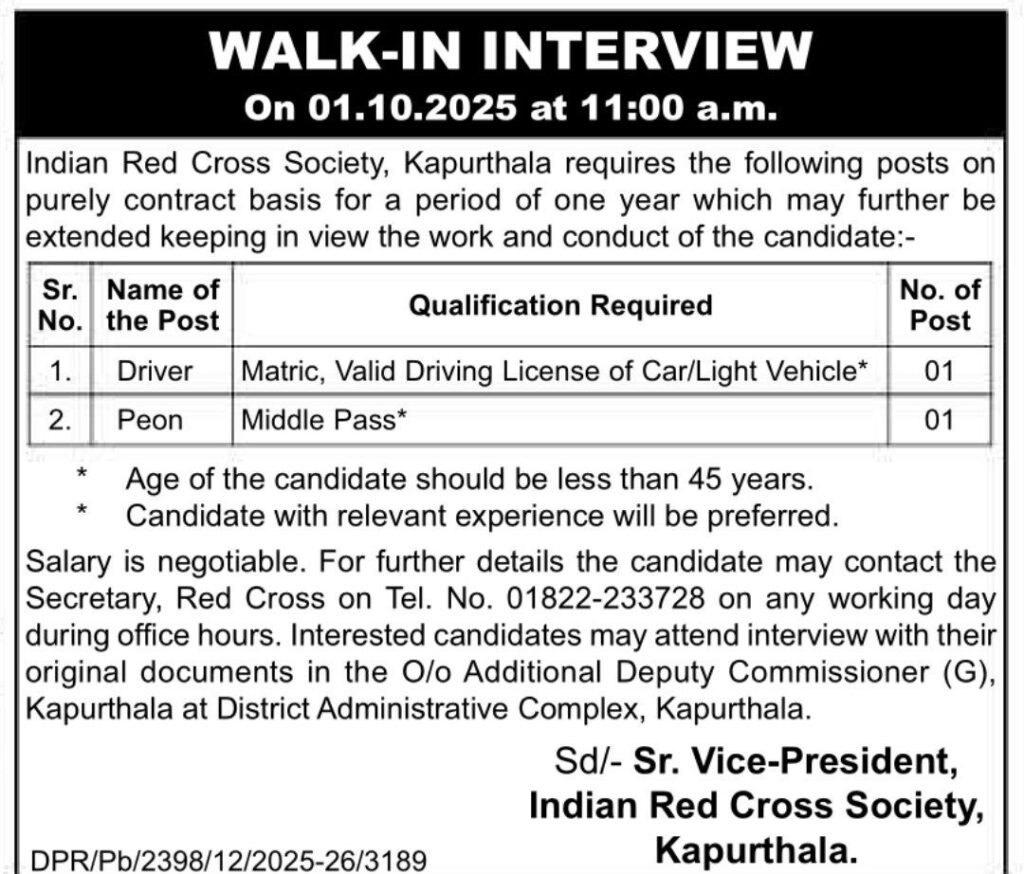 Indian Red Cross Society, KapurthalaKapurthala Red Cross Society Vacancy 2025Driver, Peon Vacancy 2025WALK-IN INTERVIEWwww.RozgarNews.Com