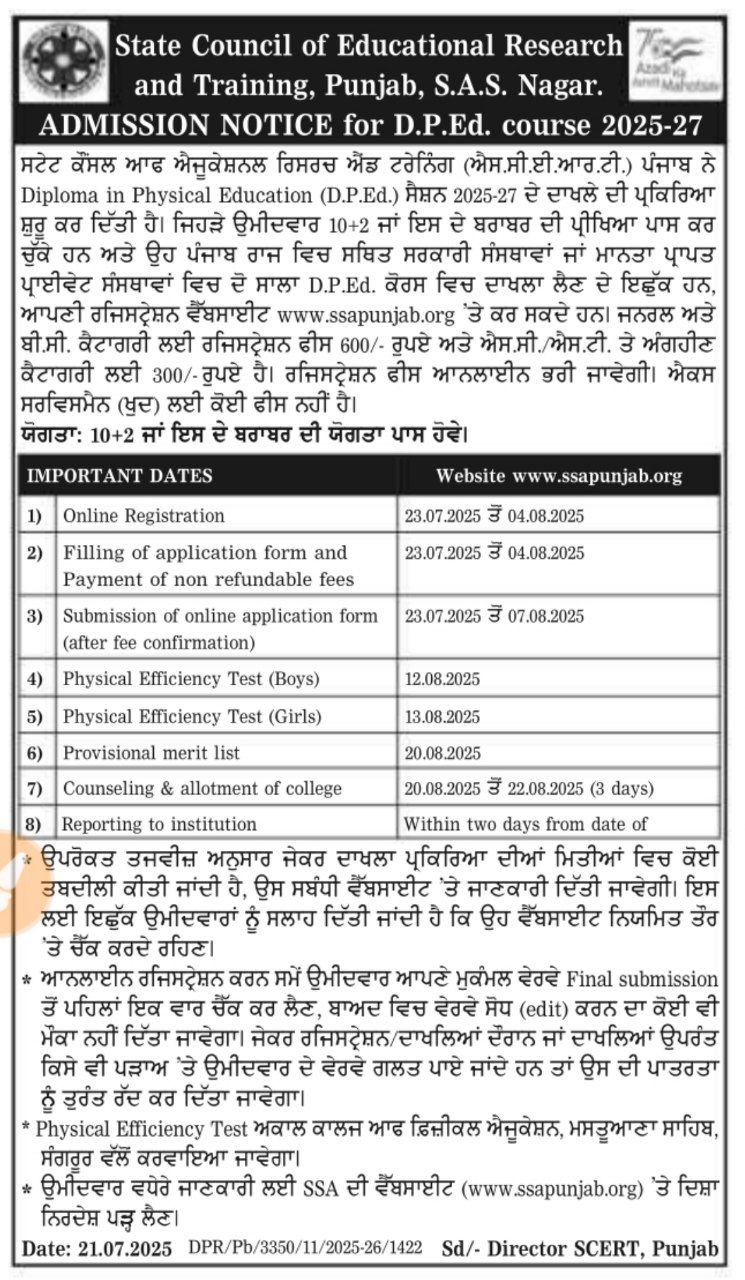 Diploma in Physical Education (D.P.Ed.)Punjab D.P.Ed. Admission Online Form 2025State Council of Educational Research |
