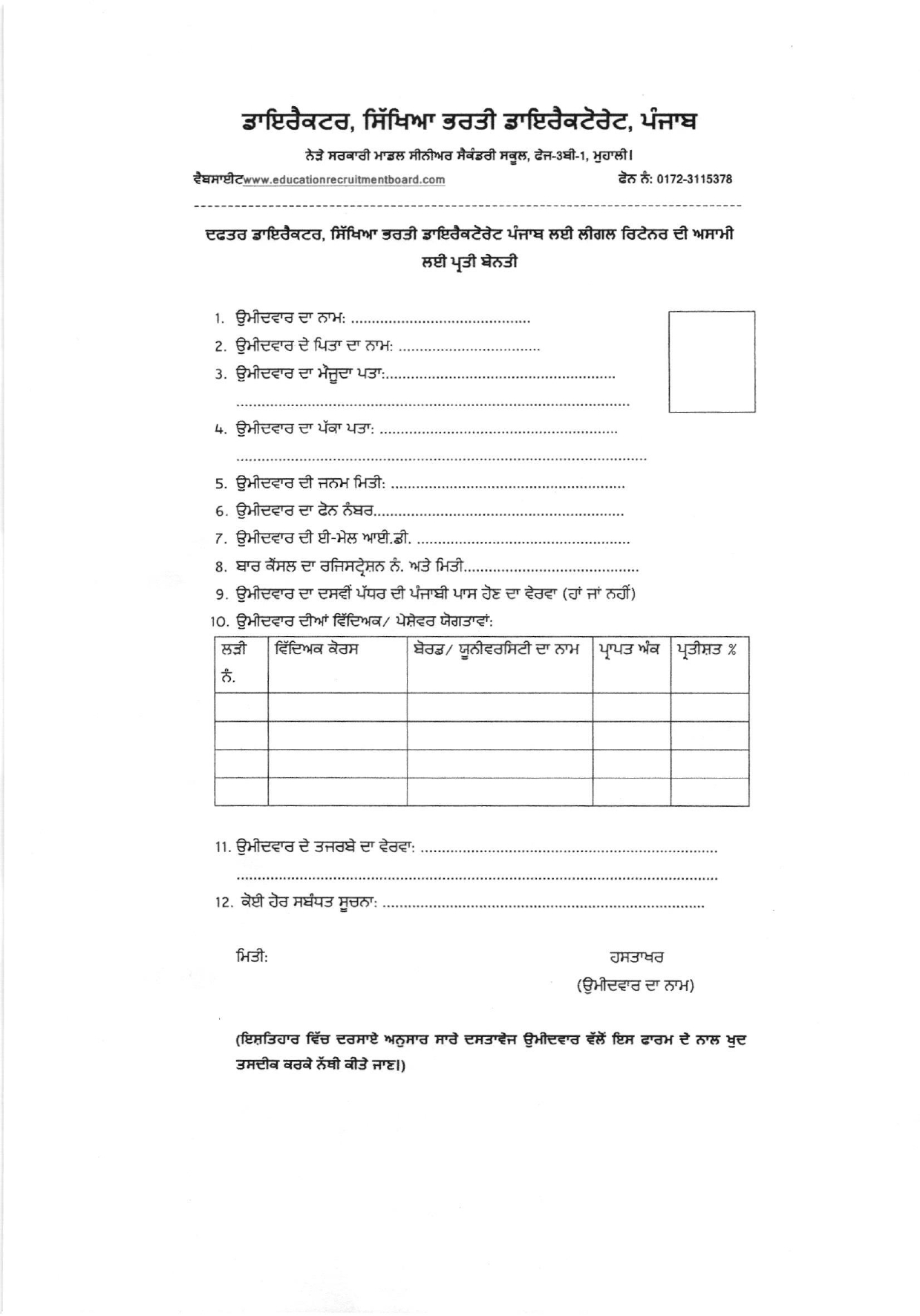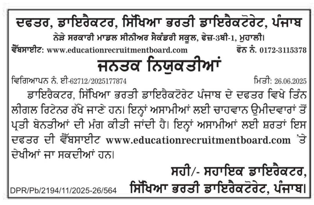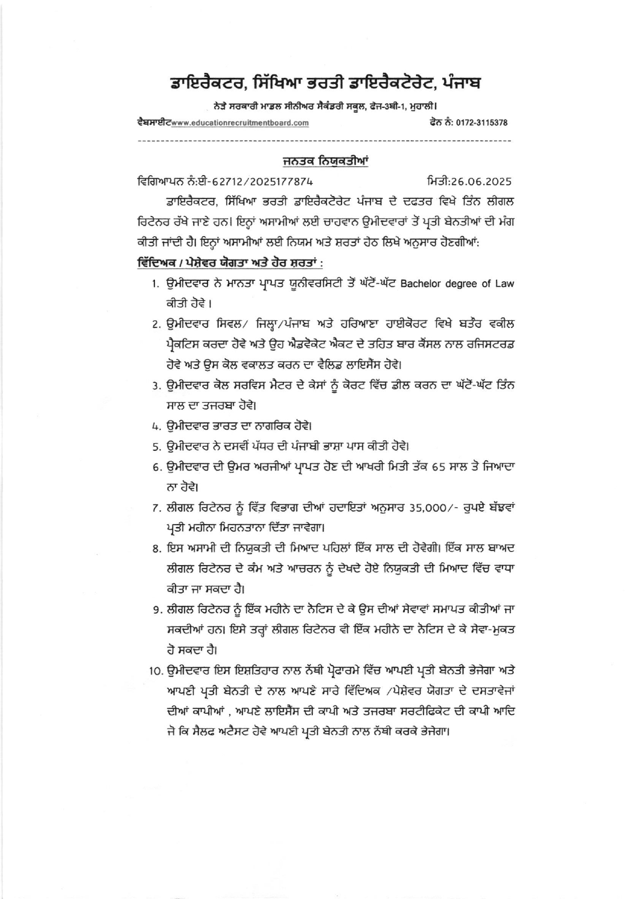 Punjab Education Department Recruitment 2025Department of School Education – Punjab (INDIA)Legal Retainer Recruitment 2025www.RozgarNews.Com