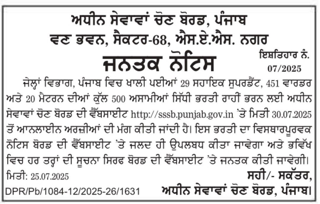 Punjab Subordinate Services Selection Board (PSSSB)PSSSB Warder and Matron Recruitment 2025Punjab Jail Department Warder and Matron Recruitment 2025Advt No. : 07/2025 Short Details of Notificationwww.RozgarNews.Com