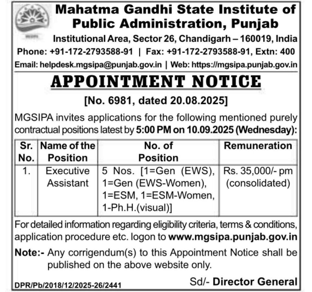 Mahatma Gandhi State Institute PunjabExecutive Assistant Post Offline Form 2025[No. 6981, dated 20.08.2025] Short Detailswww.RozgarNews.Com
