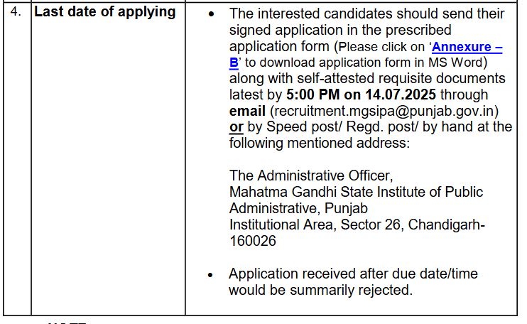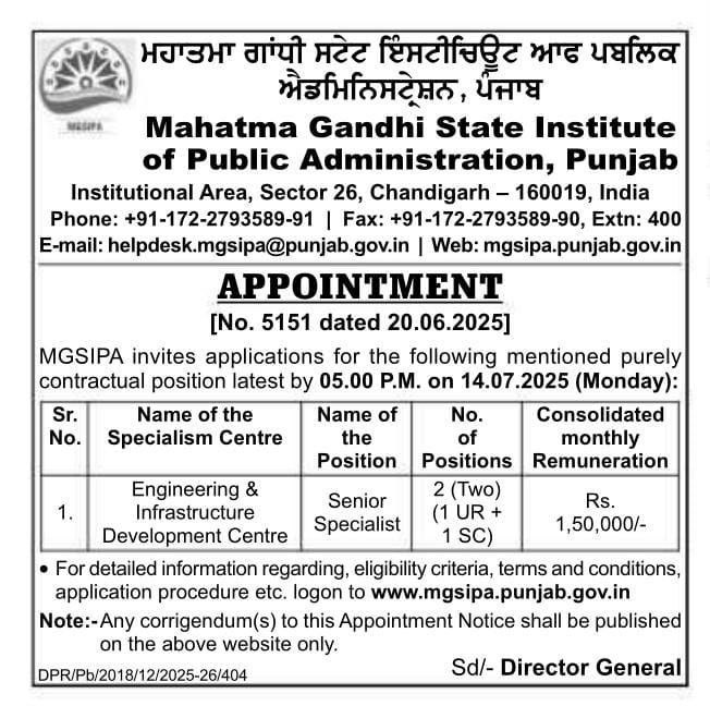 Mahatma Gandhi State Institute of Public Administration,PunjabPunjab MGSIPA Senior Specialist Post Form 2025ENIOR SPECIALIST’ in MGSIPA’s Specialism Centre |