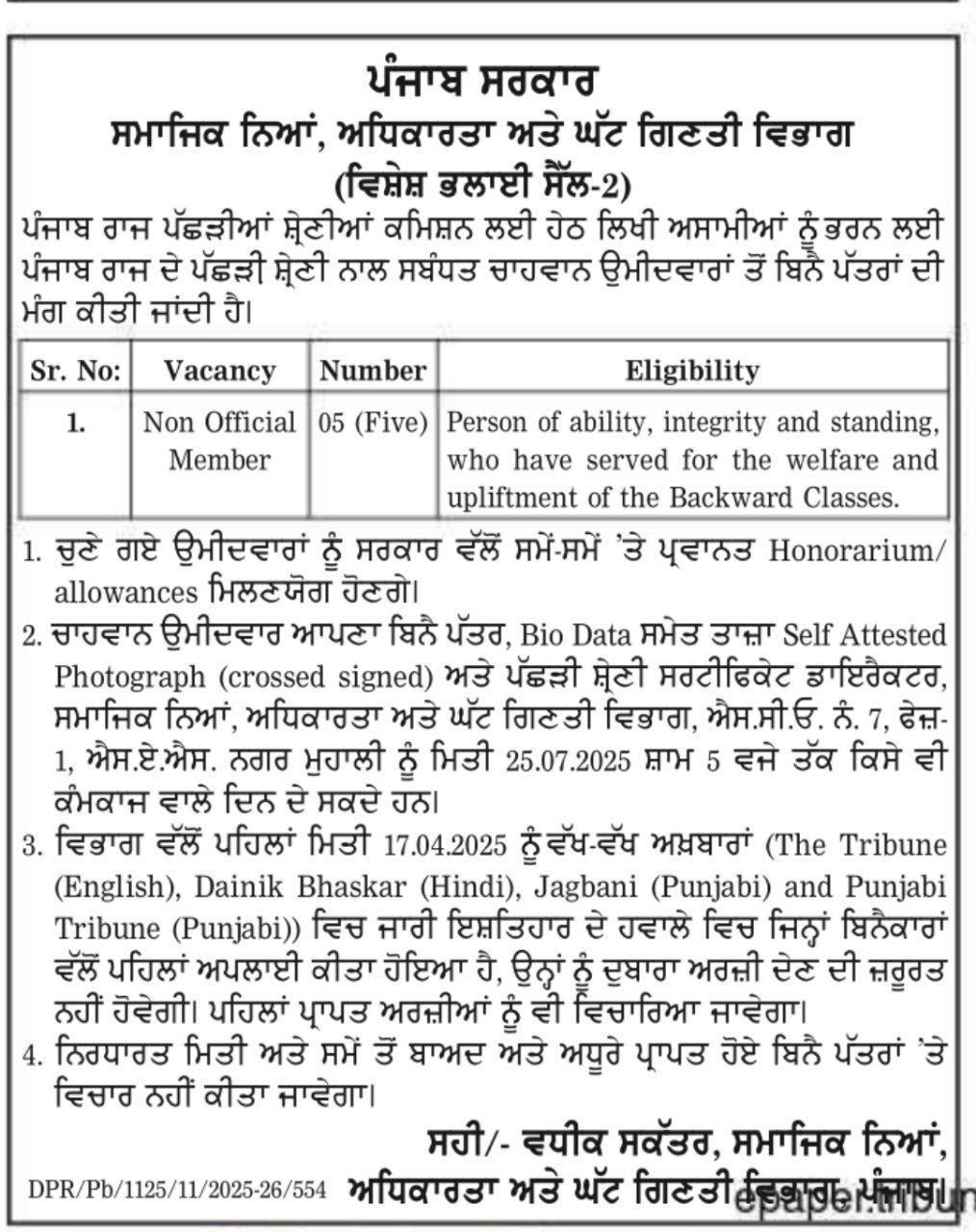 • ਡਾਇਰੈਕਟਰ, ਸਮਾਜਿਕ ਨਿਆਂ, ਅਧਿਕਾਰਤਾ ਅਤੇ ਘੱਟ ਗਿਣਤੀ ਵਿਭਾਗ, ਐਸ.ਸੀ.ਓ. ਨੰ. 7, ਫੇਜ਼- 1, ਐਸ.ਏ.ਐਸ. ਨਗਰ ਮੁਹਾਲੀ ਨੂੰ ਮਿਤੀ 25.07.2025 ਸ਼ਾਮ 5 ਵਜੇ ਤੱਕ ਕਿਸੇ ਵੀ ਕੰਮਕਾਜ ਵਾਲੇ ਦਿਨ ਦੇ ਸਕਦੇ ਹਨ।