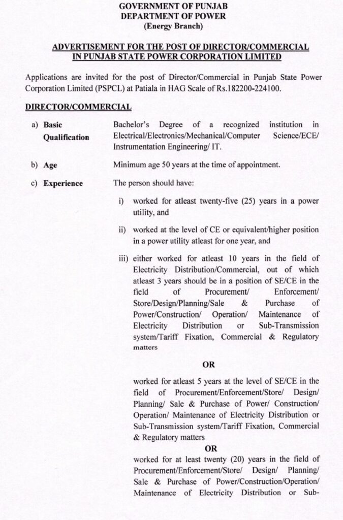 Punjab PSPCL DIRECTOR/COMMERCIAL POST 2025