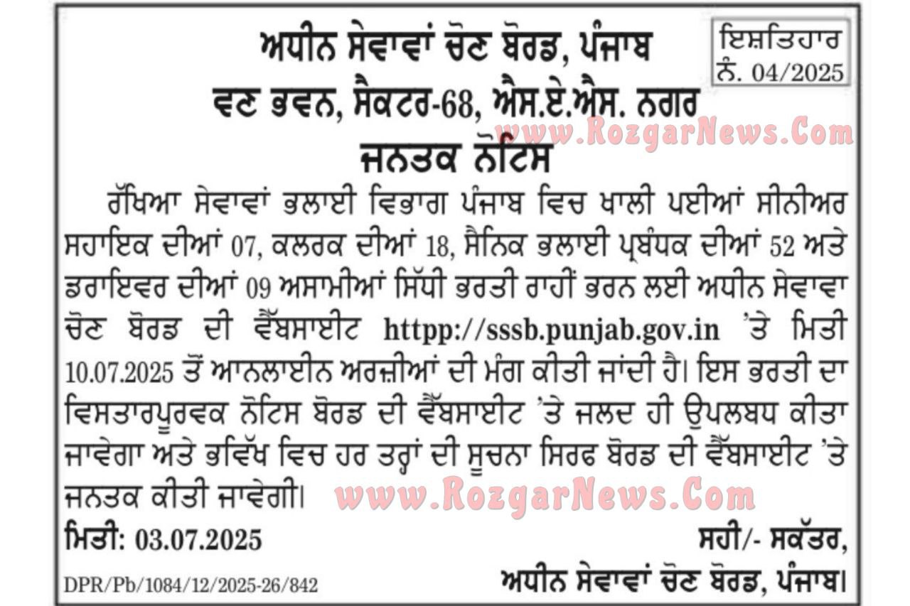 Driver | Should be an Ex- Serviceman; ii) Should be middle pass with Punjabi as one of the subjects, or should hold the equivalent Army Educational Certificate; and iii) Should hold a driving license for Light Motor Vehicle. iv) In Punjab Civil Services (General and Common Conditions of Service) Rules, 1994, clause 17. Knowledge of Punjabi Language- Provided further that where educational qualifications for a post in any service are lower than the Matriculation standard, the person so appointed shall have to pass an examination of Punjabi language equivalent to Middle standard. |