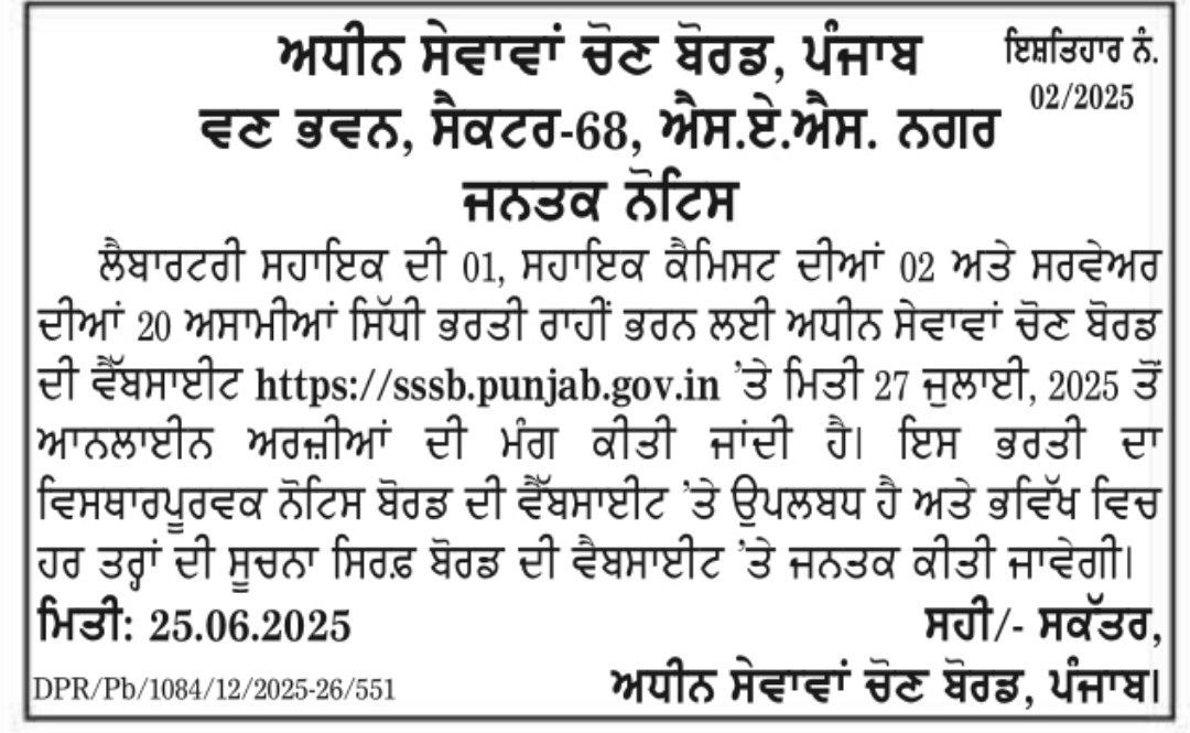 Punjab Subordinate Service Selection Board (PSSSB)Surveyor & Various Recruitment 2025(Tentative) Advt No. : 02/2025 Short Detailswww.RozgarNews.Com