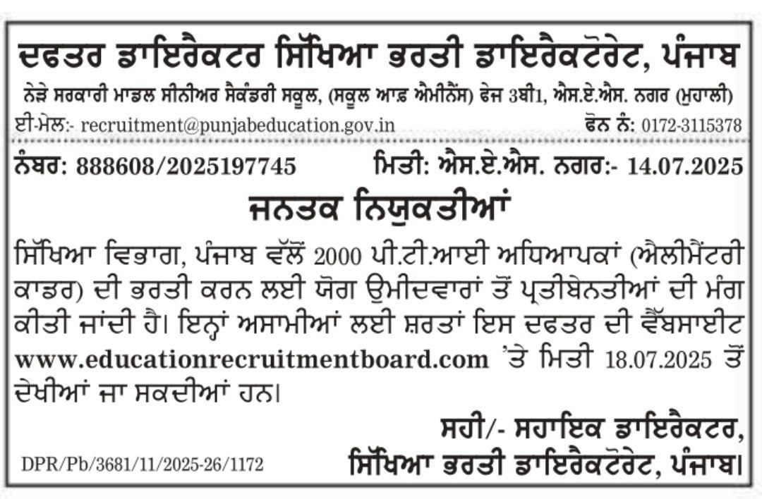 Punjab Education Recruitment Board (PERB), PunjabPERB PTI Teacher (2000 Post) Recruitment 2025Short Details Of Advertisement Notificationwww.RozgarNews.Com
