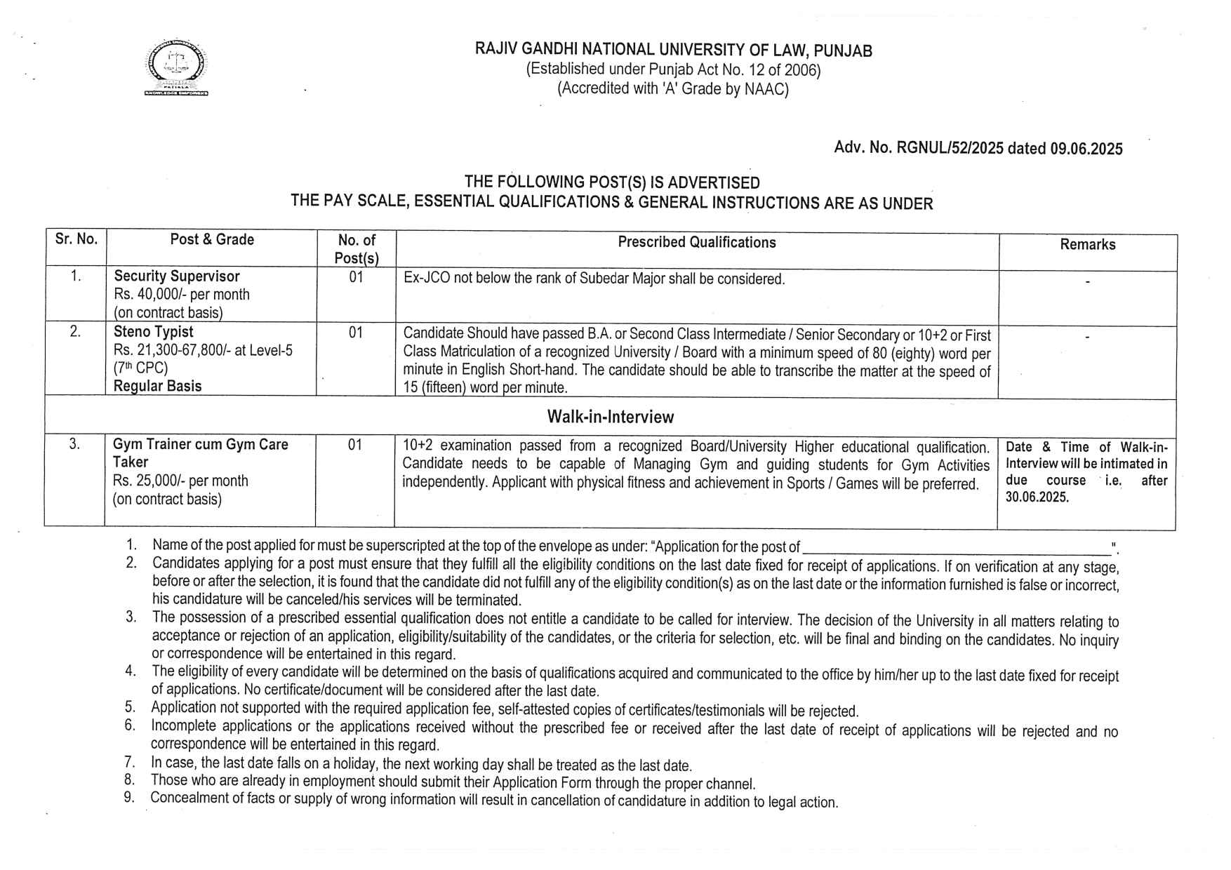 | Gym Trainer cum Gym Care Taker (Contract basis) | 01 Rs. 25,000/- per month | Walk-in-Interview 10+2 Examination |