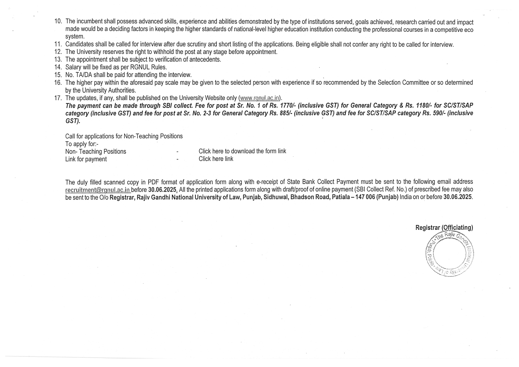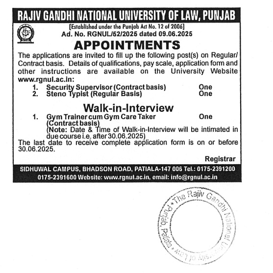 RAJIV GANDHI NATIONAL UNIVERSITY OF LAW, PUNJABPunjab Security Supervisor Recruitment 2025Security Supervisor (Contract basis) |