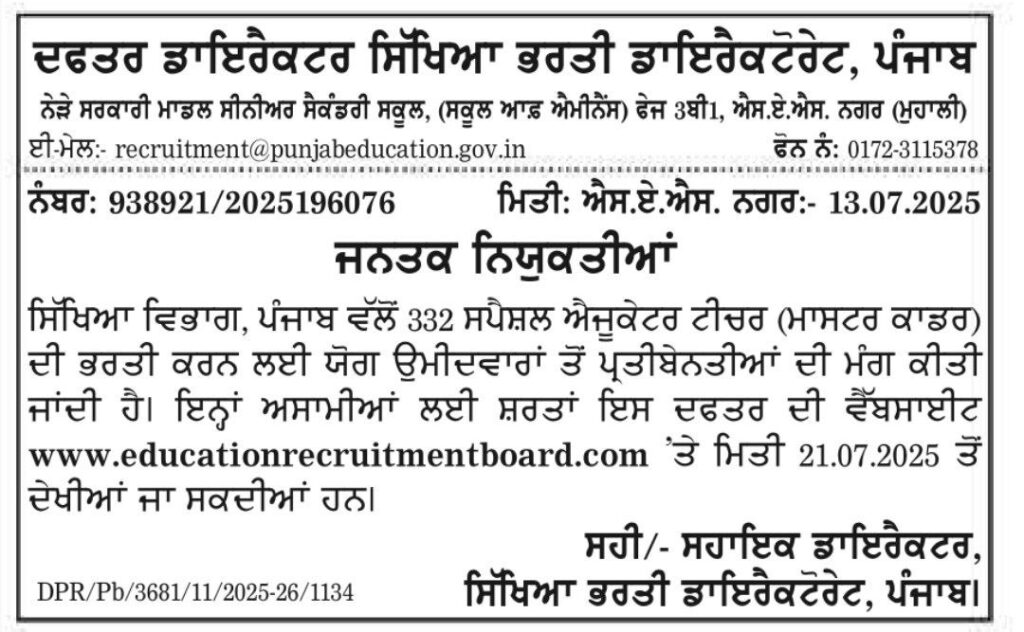 Punjab Special Education Teacher (Master Cadre) Recruitment 2025Director of Education Recruitment Directorate, PunjabEducation Recruitment Board PunjabPunjab Special Educator Teacher Master Cadre Recruitment 2025Short Detailwww.RozgarNews.Com