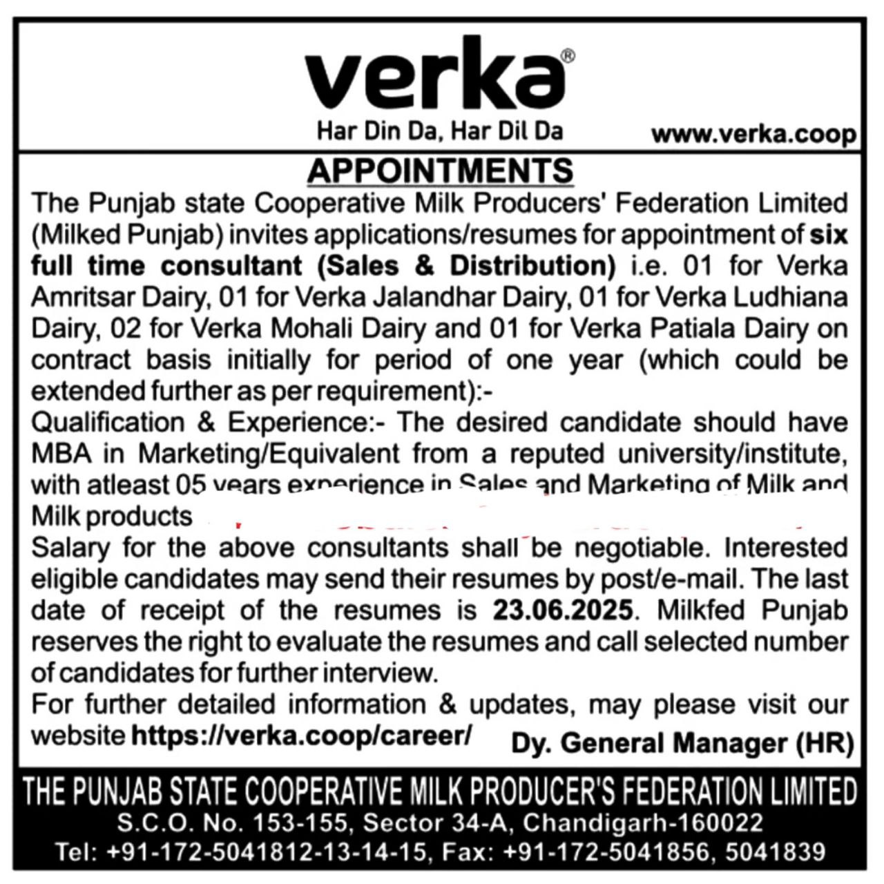| consultant (Sales & Distribution) | 06 | The desired candidate should have MBA in Marketing/Equivalent from a reputed university/institute, with atleast 05 years experience in Sales and Marketing of Milk and Milk products. |